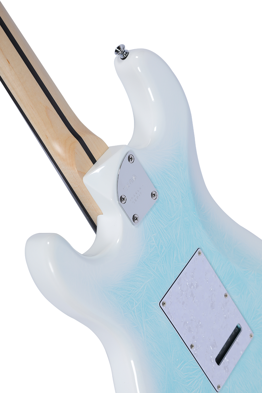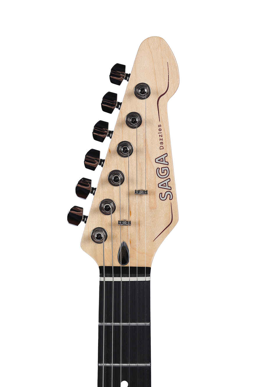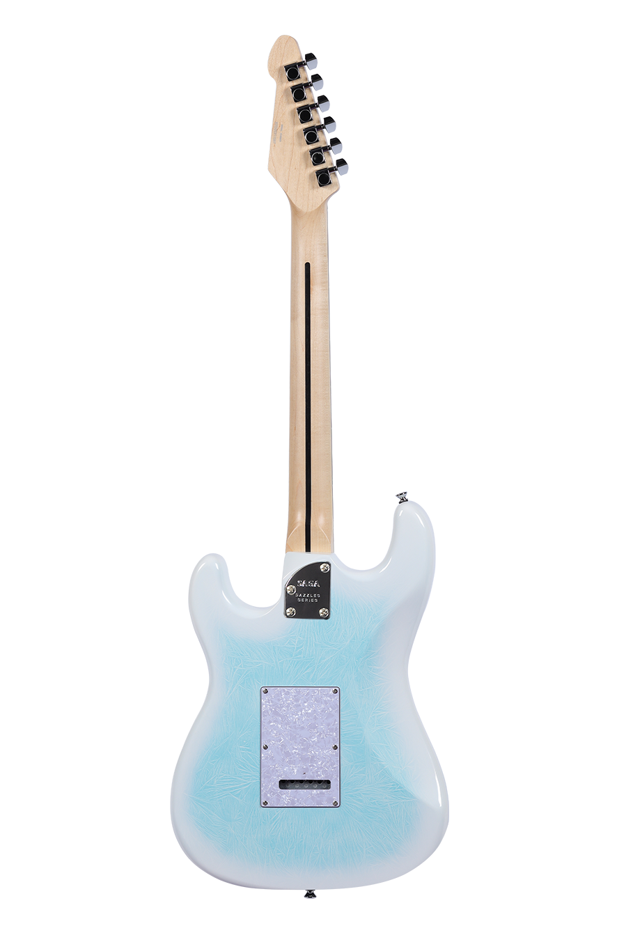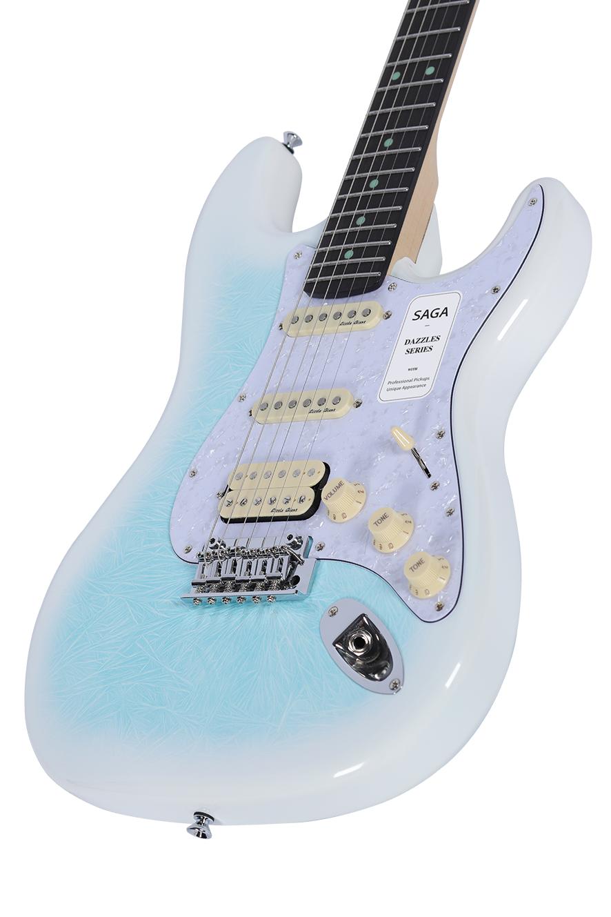Dazzles Celectial Blue — Handcrafted with a unique crackled-ice top&back finish, this guitar showcases exquisite craftsmanship and stunning aesthetics, winning the hearts of many players. Outfitted with SAGA’s self-developed Little Giant II pickups and a compact double-locking tremolo bridge, it delivers not only exceptional tone but also superior performance capability.