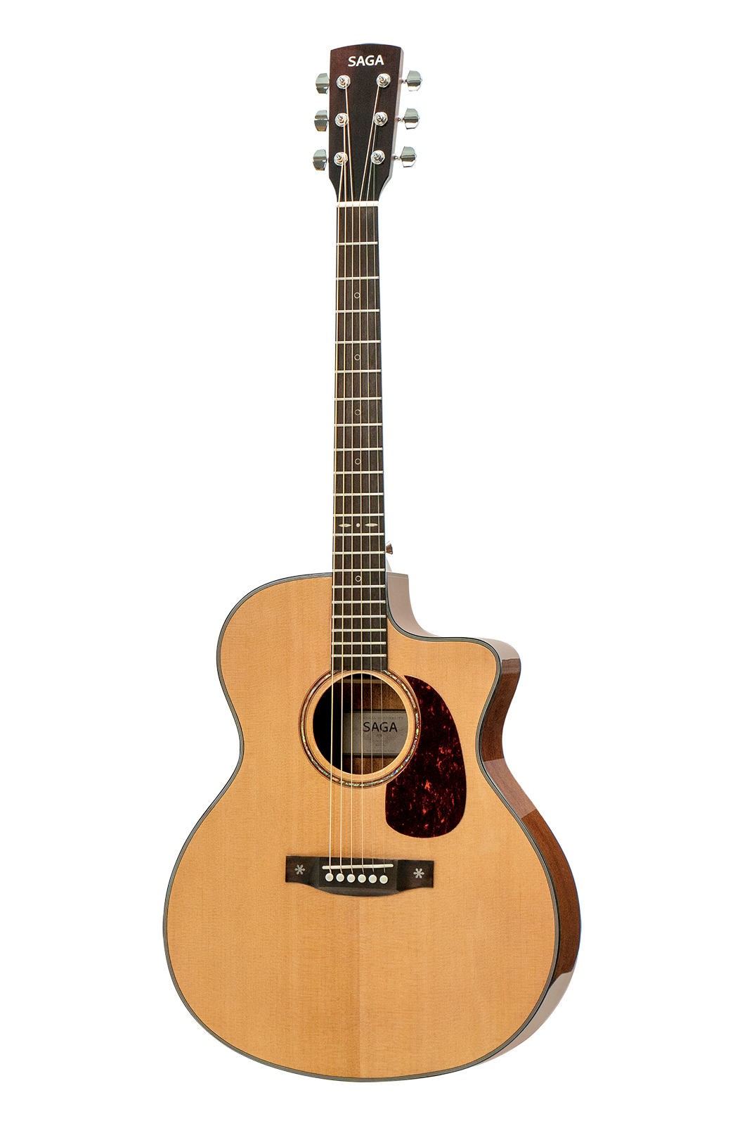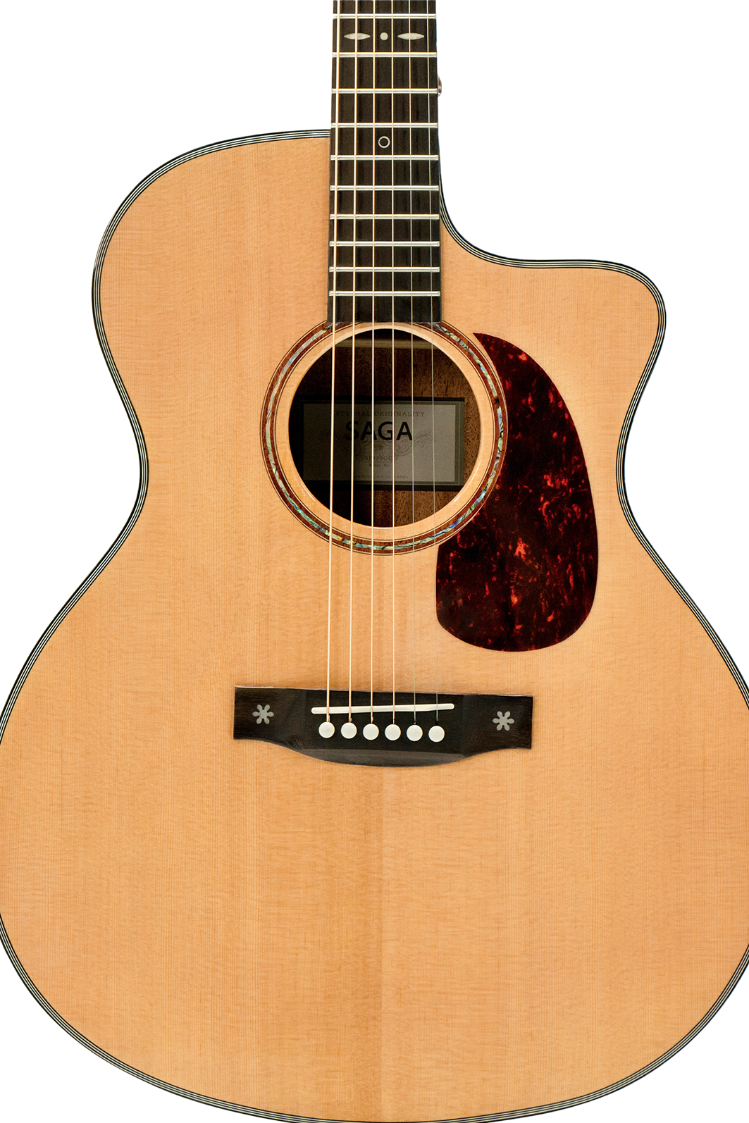 The SAGA 830 Series features a torrefied solid Sitka spruce top, whose heat-treated timber blends stiffness and elasticity to deliver a warm, open tone with a broad dynamic range and crisp articulation. Paired with mahogany back and sides that add warmth, focused mids and stable projection, the 830 offers refined tonal depth and reliable performance across changing climates.