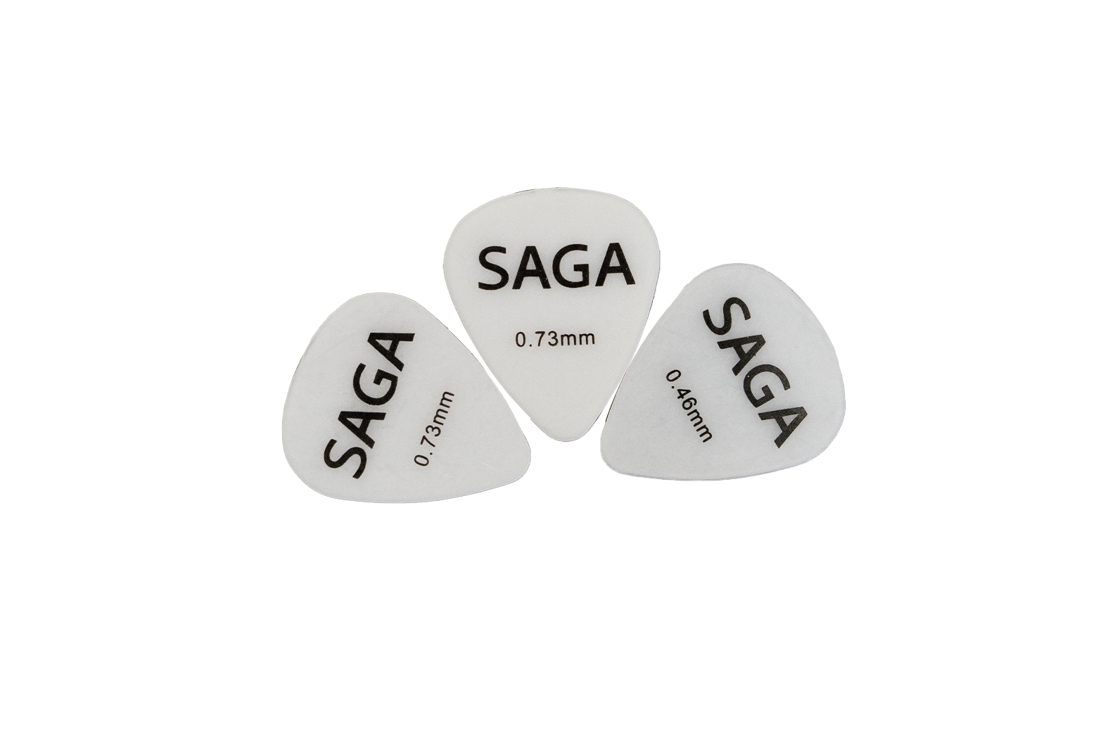 The SAGA P2 Picks are crafted from classic celluloid, offering toughness, slip resistance, durability, and a smooth feel. Each set comes with three picks of varying thicknesses for different styles:
